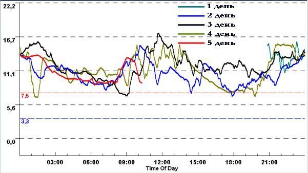 С другой стороны, непрерывный длительный мониторинг гликемии с использованием прибора CGMS Gold (Continuous Glucose Monitoring System Gold), совместно с данными дневника самоконтроля, обеспечивают наиболее полную информацию о направлении, величине, продолжительности, частоте и причинах изменений глюкозы в крови в течение суток, позволяя, таким образом, более адекватно оценивать степень компенсации углеводного обмена больных сахарным диабетом и рационально корректировать терапию (рис.1).