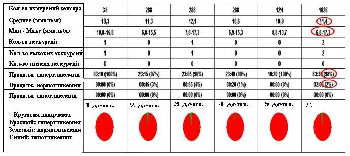 Шокирующим открытием стал тот факт, что пациенты, использующие столь частые измерения гликемии в течение суток и получающие, как казалось, хорошую сахароснижающую терапию, находились в нормогликемическом диапазоне всего около 65% времени в день, а временной интервал, в течение которого они достигали строгого гликемического контроля (до 5,5 ммоль/л перед едой и до 7,5 ммоль/л через 2 часа после приема пищи), составлял менее 30% в сутки. Это свидетельствует о том, что существующие методы мониторинга и терапии диабета недостаточны для ежедневного поддержания нормогликемии. Почти 30% времени пациенты находились в гипергликемическом диапазоне с более выраженной тенденцией к гипергликемии (повышенному уровню сахара в крови) в дневные часы, что, вероятно, было обусловлено вкладом гипергликемии через 2 часа после еды. Этот феномен, к сожалению, ранее недооценивался при использовании традиционного мониторинга гликемии с помощью глюкометров. Кроме того, были получены данные о периодах гипогликемии, на которые приходилось около 8% времени. Важно, что периоды низкого сахара крови чаще имели место в ночное время и не фиксировались пациентами при помощи глюкометров. Столь частые гипогликемические эпизоды ранее редко определялись стандартными средствами самоконтроля уровня сахара в крови.