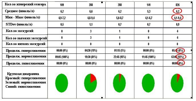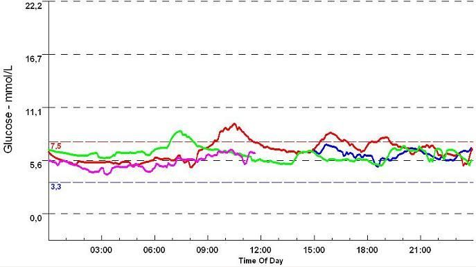 В исследовании Einhorn с соавт. результаты 88% пациентов, прошедших постоянное мониторирование глюкозы крови с помощью системы CGMS, потребовали такого изменения схемы инсулинотерапии или таблетированных препаратов, которое невозможно было прогнозировать, несмотря на интенсивное исследование глюкозы крови с помощью глюкометра.